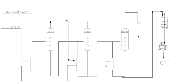 通过串联多个蒸发器单元,利用前效产生的二次蒸汽作为后效蒸发器的热源进行蒸发,从而高效去除水中盐分,并实现水资源回收的工艺。